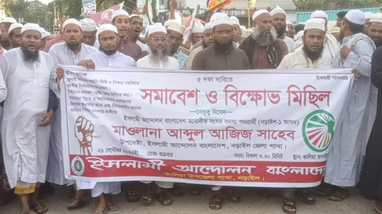 সমাবেশ ও বিক্ষোভ মিছিলের নেতৃত্বদানকারী নড়াইল-১ এর ইসলামি আন্দোলনের এমপি প্রার্থী মাও আব্দুল আজিজ বলেন, ইসলামি আন্দোলন ক্ষমতায় গেলে মানুষের জানমালের হেফাজত করবে এবং বেকার যুবকদের কর্মসংস্থানের ব্যবস্থা করবে। সংখ্যা লঘু বলে কোন শব্দ থাকবেনা। নারীদের সমান অধিকার নয় অগ্রাধিকার দেওয়া হবে।