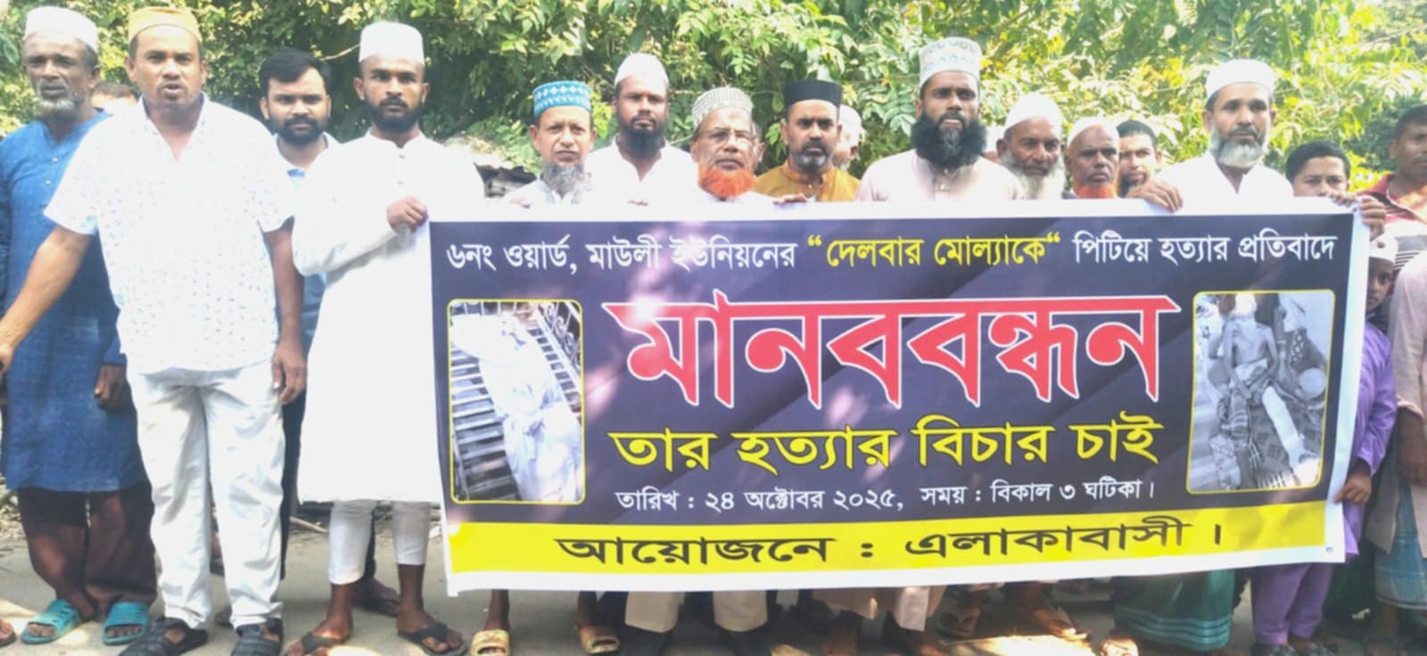 এখন আবার কেউ নিজের বাড়িতে আগুন লাগিয়ে বিভ্রান্তি তৈরি করছে, যা আরও নিন্দনীয়। আমরা চাই, প্রশাসন সত্য উদঘাটন করে প্রকৃত অপরাধীদের আইনের আওতায় আনে এবং নিরপরাধ মানুষকে রক্ষা করে।” বক্তারা আরও বলেন, দেলবার মোল্যার হত্যার ন্যায়বিচার দ্রুত নিশ্চিত করতে হবে এবং এলাকায় শান্তি ও সম্প্রীতির পরিবেশ বজায় রাখতে প্রশাসনকে আরও সক্রিয় ভূমিকা নিতে হবে। মানববন্ধনের শেষে নিহতের পরিবারের প্রতি গভীর সহানুভূতি জানিয়ে বক্তারা বলেন, এ ঘটনার ন্যায়বিচার না হওয়া পর্যন্ত এলাকাবাসী ঐক্যবদ্ধভাবে আন্দোলন চালিয়ে যাবে।
