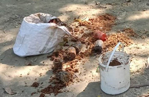 স্থানীয় সূত্রে জানা যায়, গোগা গ্রামের বাসিন্দা মোজাম্মেল হক ও তার ভাই দুরুদ আলী তাদের পিতার কবর জিয়ারত করতে বাগানপাড়ার কবরস্থানে যান। এসময় তারা কবরের পাশে কাঠের গুড়া ভর্তি দুটি বালতি পড়ে থাকতে দেখেন। পরে একটি বালতি সরাতে গেলে এর ভেতর ককটেল সাদৃশ বস্তু তাদের নজরে আসে। বিষয়টি সন্দেহজনক মনে হলে তারা দ্রুত গোগা বিজিবি ক্যাম্পে খবর দেন।
